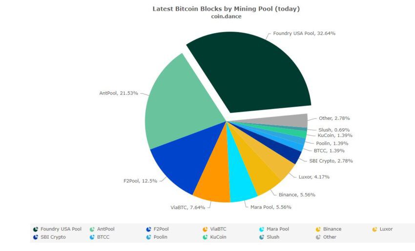 Во-вторых, майнинг биткоина также не является по-настоящему децентрализованным. По состоянию на момент написания обзора, свыше 50% хешрейта приходится всего на два майнинг-пула: Foundry USD и AntPool.