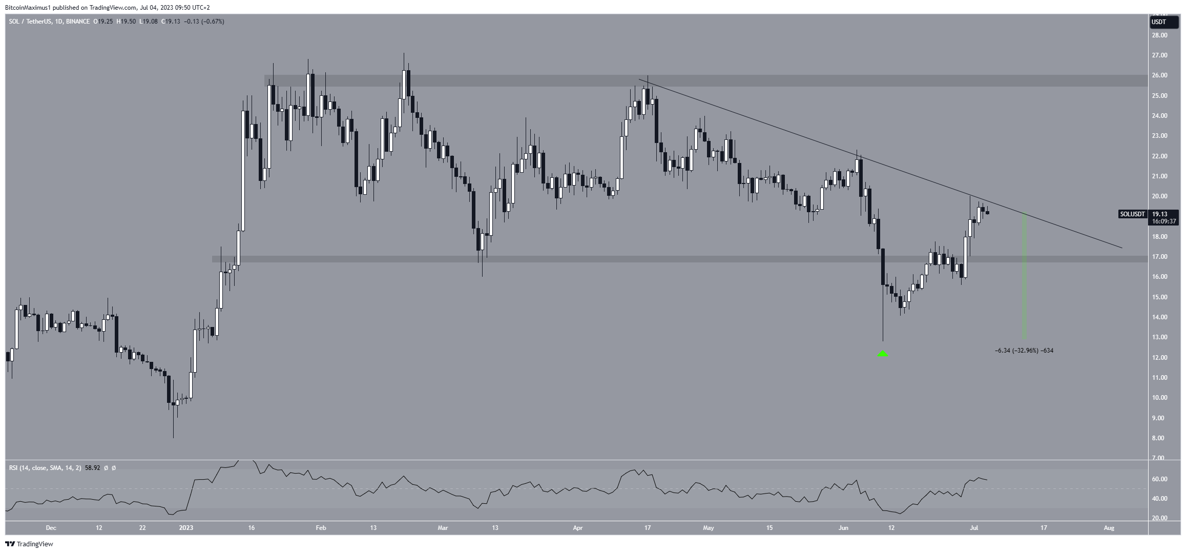 Значимость этого роста подчеркивается тем, что цена отыграла горизонтальную область $17. После предыдущего медвежьего прорыва ожидалось, что данная область окажет сопротивление. Однако после первоначального отскока 20 июня (красный значок) цена SOL поднялась выше этой области и 30 июня достигла максимума на $20.