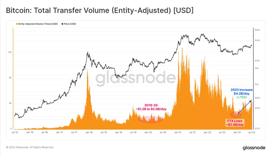 На фоне снижения ажиотажа вокруг Ordinals индикаторы сетевой активности стали указывать на некоторое ослабление. В частности медиана транзакционных комиссий опустилась до $0,16, среднее значение — до $1,33. Исключение составляет метрика переданной ончейн стоимости — показатель достиг $4,2 млрд (+75% с начала года).