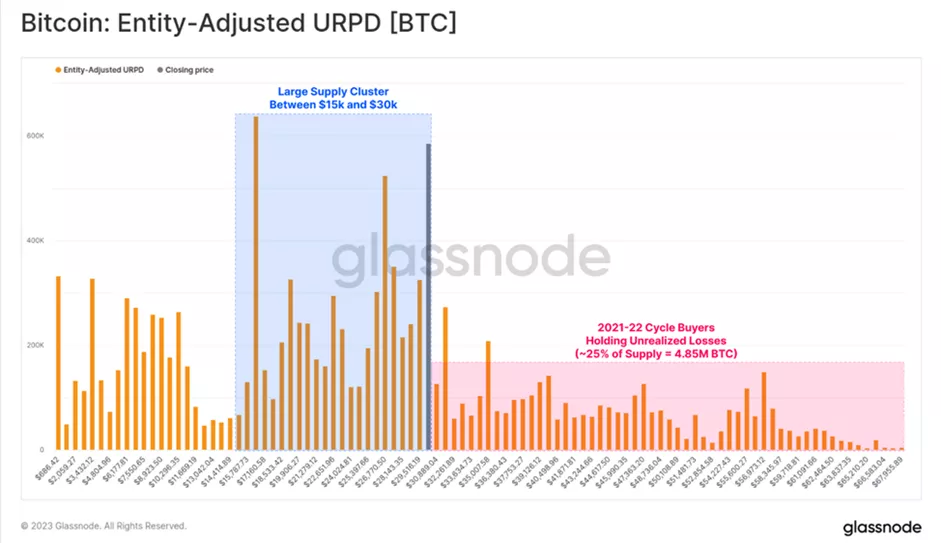 Только четверть доступного предложения инвесторы купили по ценам выше $30 000 в период цикла 2021-2022 годов. Значительный объем у ходлеров пришелся на покупки в диапазоне от $15 000 до $25 000. В коридоре от $20 000 до $30 000 с февраля 2023 года наблюдается рост накопления, несмотря на усиление регуляторного давления в США.