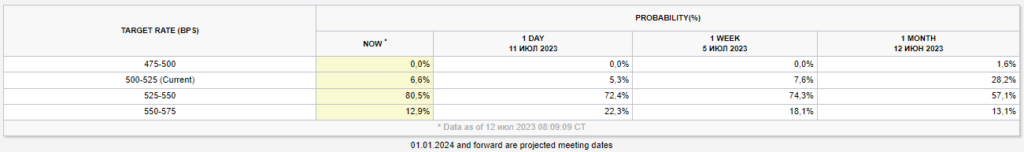 Данные принципиально не сказались на ожиданиях касательно возможного повышения ключевой ставки на заседании ФРС 25–26 июля. Вероятность того, что это произойдет, понизилась с 93% накануне до текущих 92,4%, согласно рынку фьючерсов.