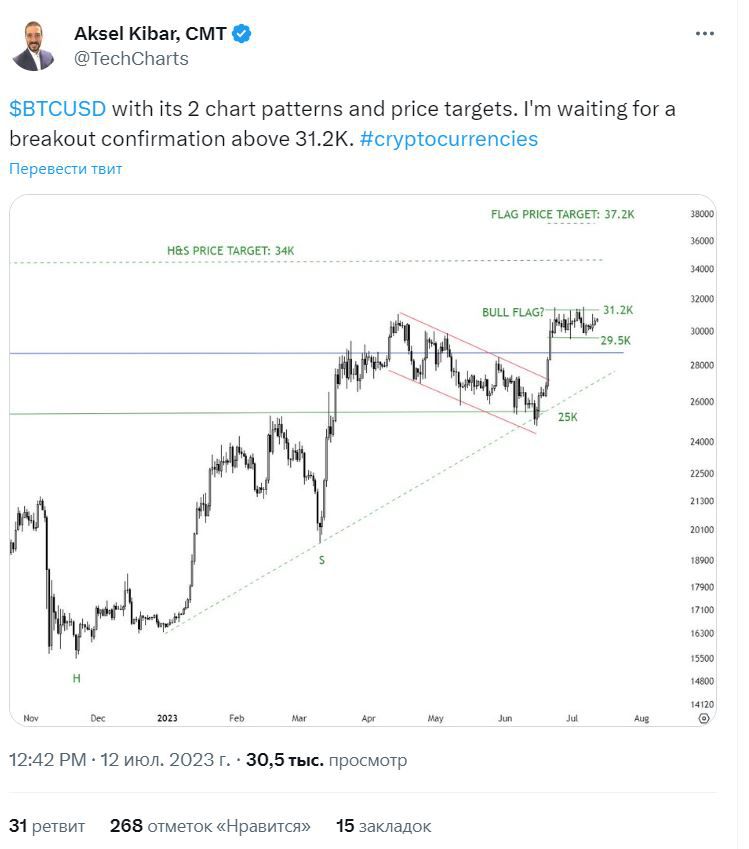 Трейдер Аксель Кибар видит потенциал скорого выхода монеты в рост. Свой позитивный прогноз курса биткоина он объяснил предположением о том, что на графике криптовалюты сформировалась фигура технического анализа — бычий флаг, которая может быть предвестником позитивного движения монеты. В случае прорыва BTC уровня $31,2 тыс., по мнению трейдера, биткоин отправится к новому локальному максимуму близ $34 тыс.