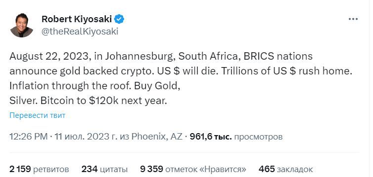 Автор бестселлера «Богатый папа, бедный папа», предприниматель Роберт Кийосаки, в свою очередь, считает, что уже в 2024 году инвесторы увидят BTC по $120 тыс. Свой прогноз биткоина он объяснил вероятным перетоком активов из слабеющего, по его наблюдениям, доллара в крипту.