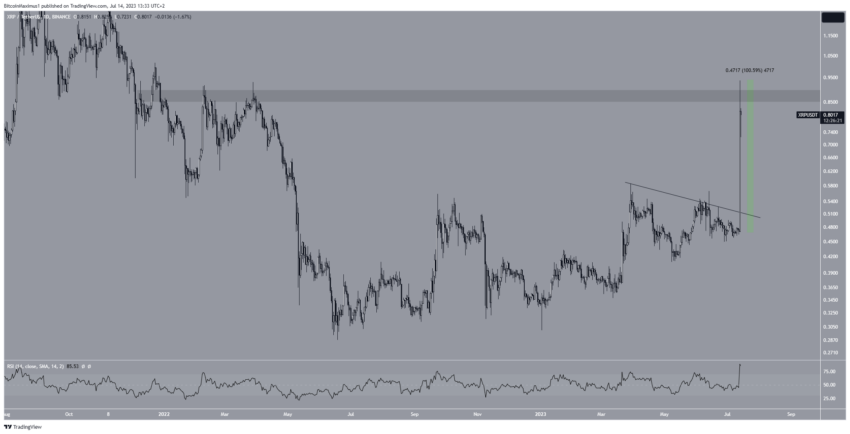 Однако 13 июля цена актива выросла почти в два раза, оттолкнувшись от линии сопротивления и достигнув при этом нового годового максимума в $0,94. Как мы отметили выше, катализатором прорыва стал положительный вердикт по делу Ripple против SEC.