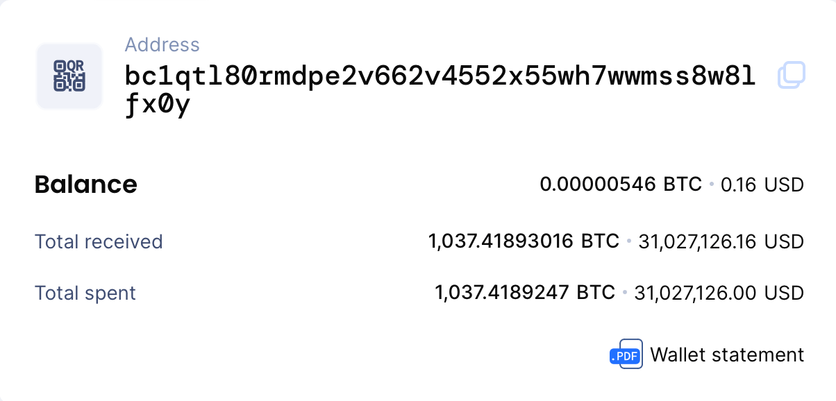 Получателем крупной транзакции стал Биткоин-адрес, начинающийся на «bc1qt180…». Сам он при этом был создан относительно недавно.