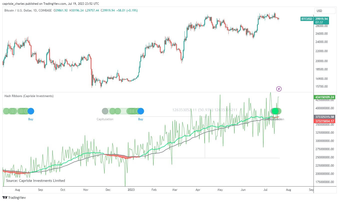 Анализ поведения майнеров на основе метрики Hash Ribbons провёл основатель инвестиционной компании Capriole Investments Чарльз Эдвардс. В целом данный индикатор показывает динамику хешрейта майнеров и смену тренда в ней. Накануне показатель продемонстрировал «чрезмерно большой» рост хешрейта, на чём также сделал акцент Эдвардс в следующей цитате.