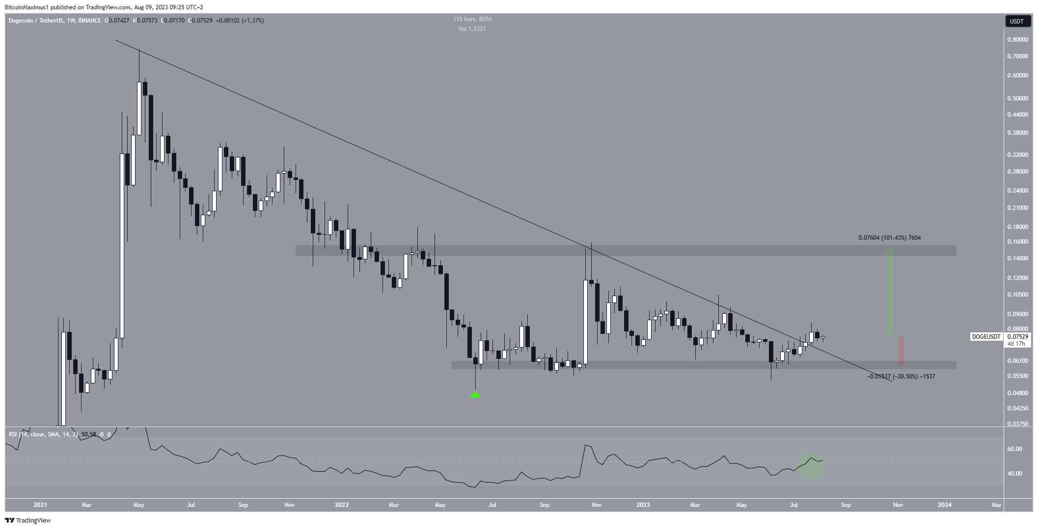 Технический анализ на недельном графике показывает, что цена $DOGE снижалась вдоль нисходящей линии сопротивления с мая 2021 года, с тех пор, как достигла исторического максимума на $0,739. В июне 2022 года цена достигла минимум на уровне $0,049 (зеленый значок).