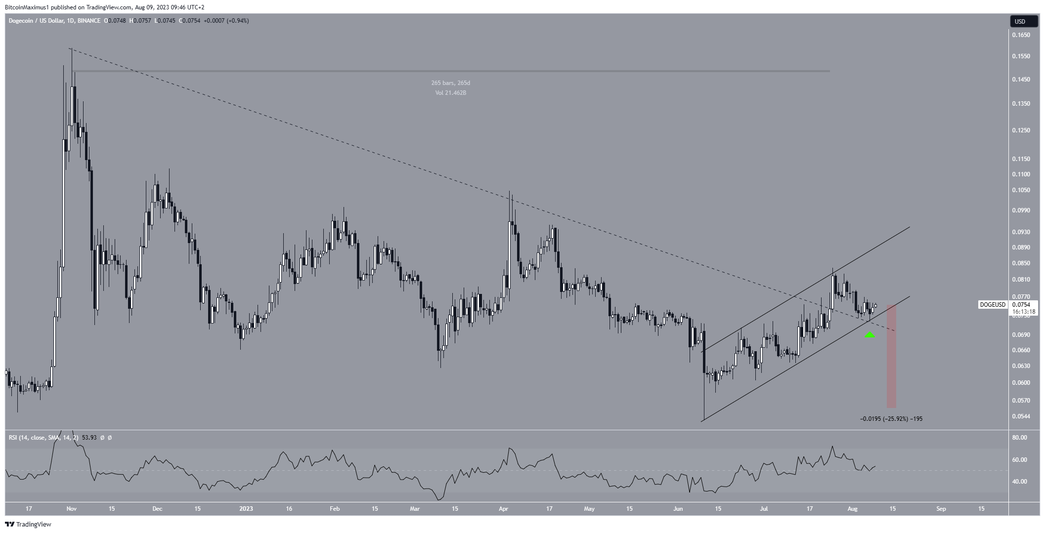 С одной стороны, 24 июля $DOGE совершил прорыв нисходящей линии сопротивления, которая просуществовала на графике 265 дней. Однако цена не смогла развить рост. Вместо этого 4 августа токен вернулся, чтобы проверить эту линию на прочность в качестве поддержки (зеленый значок).