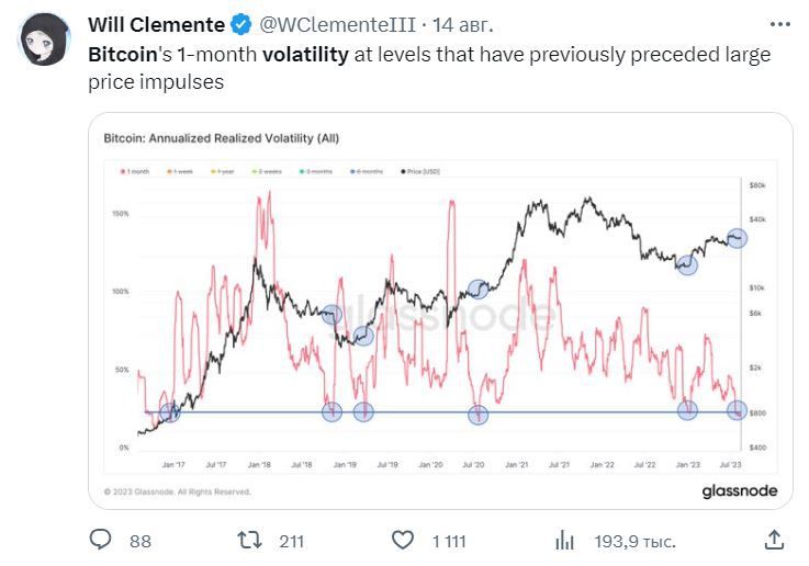 Многие участники криптосообщества считают, что такое поведение BTC — затишье перед бурей. Например, аналитик Уилл Клементе обратил внимание на то, что ранее подобные снижения волатильности предшествовали выходу курса криптовалюты в активный рост.