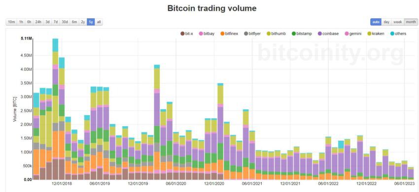 Торговый объем биткоина упал до самых низких значений за пять лет. Популярный в криптосообществе аналитик WhaleWire считает, что изменения указывают на потерю интереса к криптовалюте со стороны инвесторов. При этом, по его мнению, сформировавшиеся условия открывают перед мошенниками массу возможностей для манипулирования рынком.
