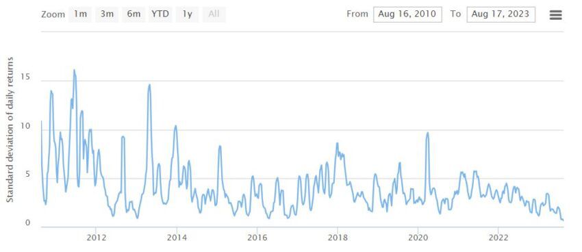 Волатильность биткоина также упала до минимальных значений.