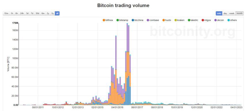 Вот как, для сравнения, выглядит график торгового объема биткоина за последние 13 лет. Пик активности пришелся на ноябрь и декабрь 2016 года.