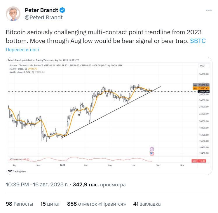 Верно предсказавший коррекцию биткоина 2018 года трейдер и аналитик Питер Брандт, в свою очередь, считает, что BTC стоит на пороге возможного прорыва сформированной в начале 2023 года трендовой линии. Движение монеты через минимумы августа, по его мнению, можно будет расценивать, как медвежий сигнал. При этом Брандт не исключил возможность формирования медвежьей ловушки. Последний сценарий, как он считает, позволит рассматривать выход BTC в рост.