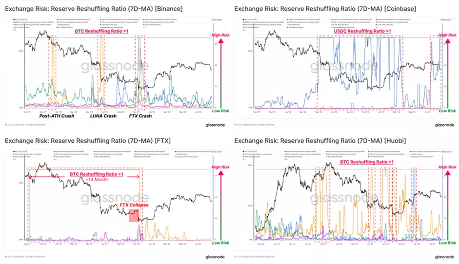 Reshuffling Ratio у Binance (на иллюстрации ниже — вверху слева) испытывает резкие пики по всем активам с быстрым возвращением в норму в периоды повышенной волатильности. В Glassnode воспринимают такое поведение как отражение волны новых депозитов и выводов средств. Для Huobi (внизу справа) характерна аналогичная ситуация.