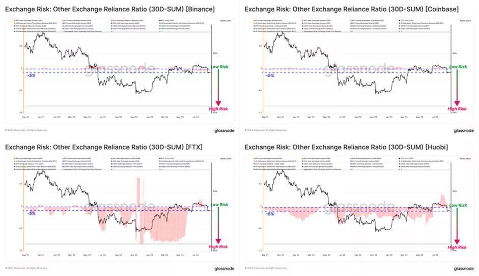 Агрегированный коэффициент Reliance Ratio демонстрирует, что Binance и Coinbase в значительной степени не зависят от других бирж. Это контрастирует с ситуацией с FTX и Huobi, где эти значения глубоко отрицательны.