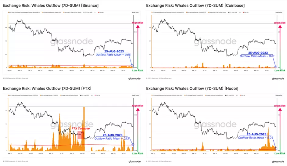 Для Huobi аналитики наблюдают модель с относительно низким уровнем риска вплоть до июня 2023 года. В последние месяцы возник устойчивый всплеск Whale Withdrawal Ratio. Эксперты подчеркнули, что частично динамика объясняется просадкой балансов платформы, что «само по себе является показателем повышенной осведомленности [китов]».