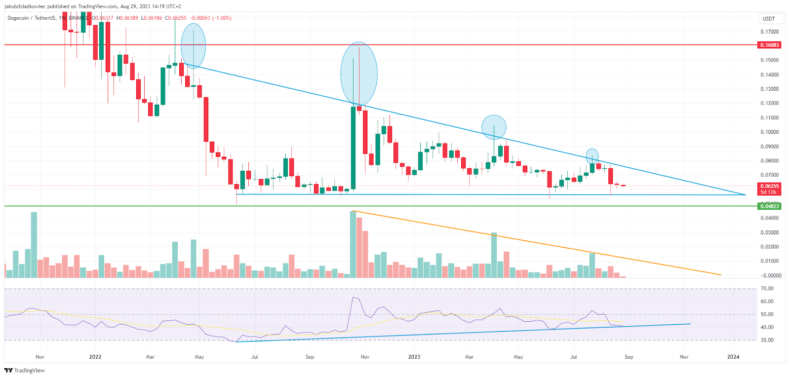 Как показывают результаты технического анализа недельного графика, картина по $DOGE выглядит неоднозначно, подавая сигналы о периоде долгосрочного аккумулирования. С января 2022 года, то есть уже 84 недели, цена движется в относительно узком торговом канале между минимумом на $0,055 и пиком на уровне $0,160.