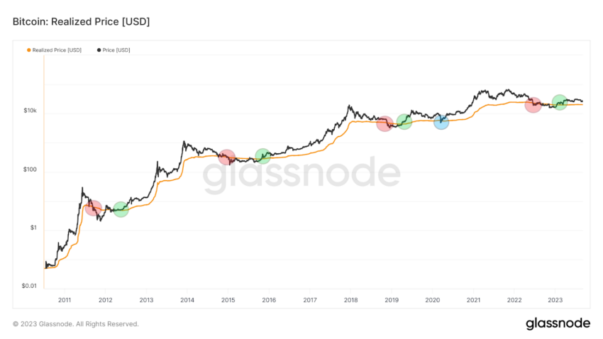 Прорыв цены BTC выше реализованной, как правило, давал начало долгосрочному бычьему рынку. На графике эти события обозначены зелеными кругами.