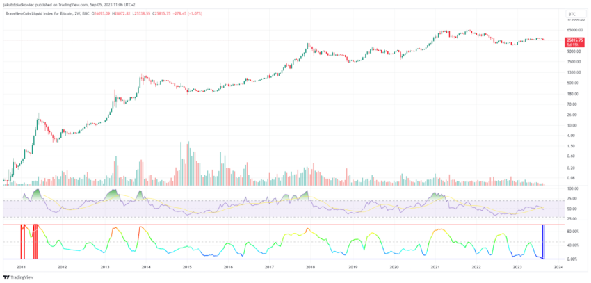 Другой известный аналитик @el_crypto_prof отметил крайне низкую волатильность биткоина на старших таймфреймах. Он обратил внимание на то, что полосы Боллинджера на 2-недельном графике BTC в настоящее время являются самыми узкими за всю историю существования актива.