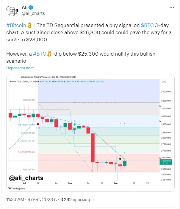 По мнению известного аналитика крипторынка Али Мартинеса, на графике биткоина появился сигнал на покупку. Эксперт заметил, что на 3-дневном графике биткоина индикатор TD Sequential подаёт сигнал на покупку.