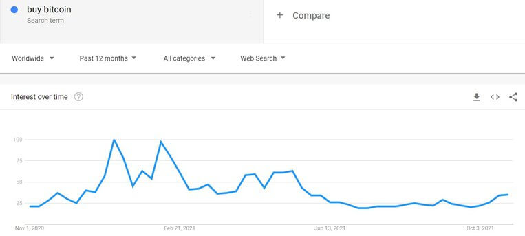 Однако сейчас ситуация выглядит совершенно иной: несколько недель назад количество запросов в крупнейшей в мире поисковой системе, содержащих слова «биткоин», либо «купить биткоин», было относительно низким. Тем не менее, вскоре после этого актив установил новый рекордный максимум в $ 67 000.
