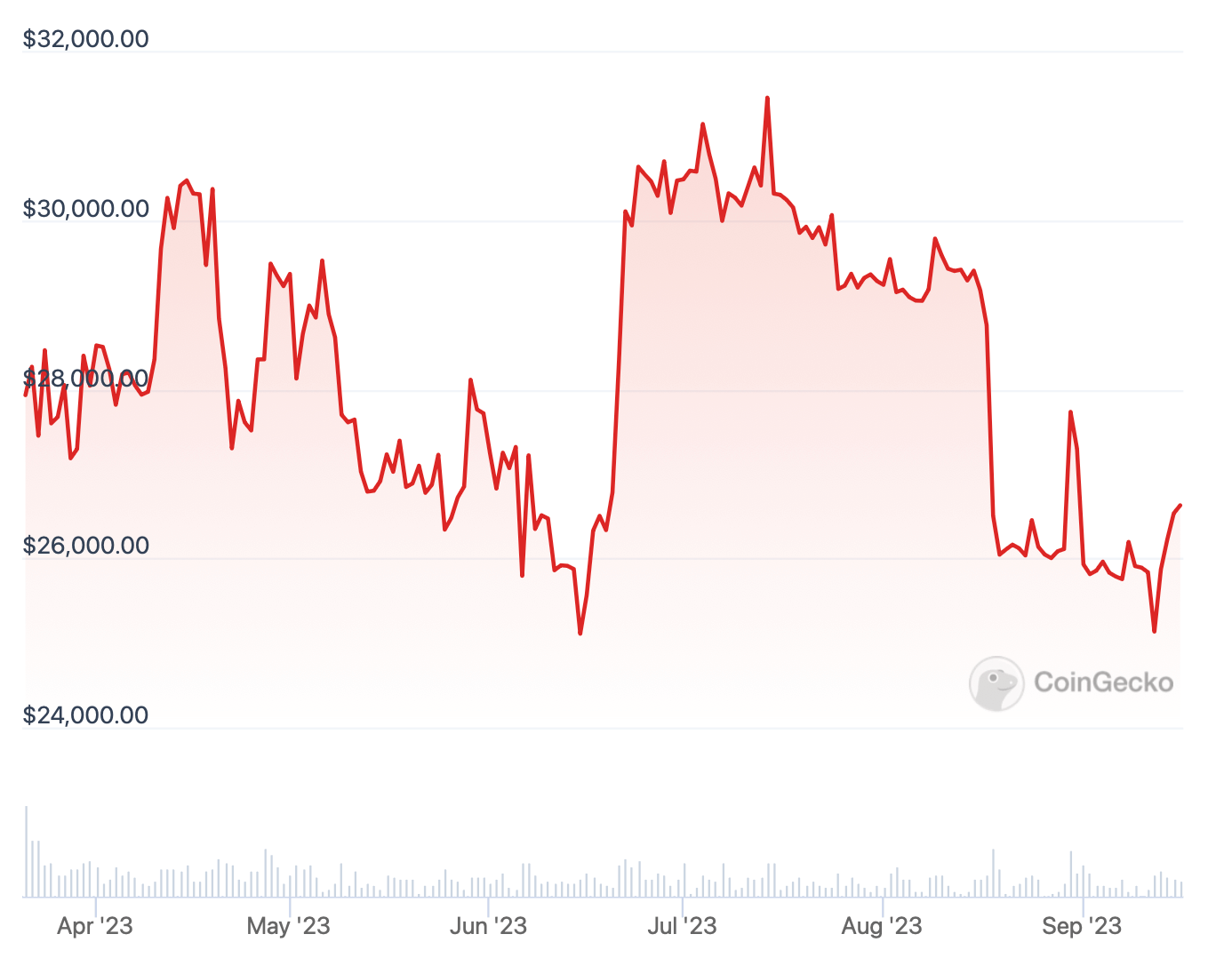 Августовская красная свеча на 1-месячном графике Биткоина была крупнейшей с момента формирования дна медвежьего тренда в ноябре 2022 года. Цена криптовалюты за август опустилась на 11.29 процента.