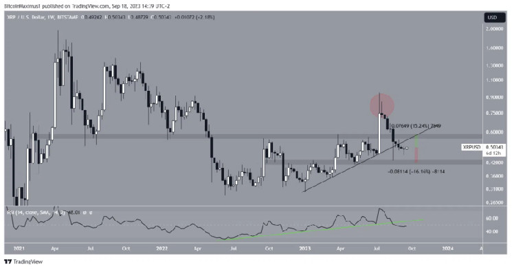 После достижения пика на уровне $0,95 в июле цена XRP пошла вниз. Примечательно, что снижение не остановилось на горизонтальном уровне $0,56, который с апреля 2021 года выполнял роль как поддержки, так и сопротивления.