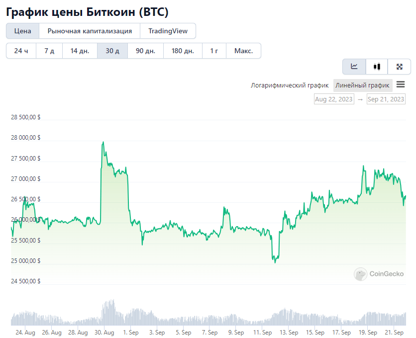 Вечером 21 сентября BTC торговался по $26 582 после краткосрочного падения на 2% за день, и некоторые трейдеры восприняли это как возможность купить на падении. Биткоин торгуется ниже 200-дневной простой скользящей средней, показав за последние 30 дней всего 13 зелёных дней (43%).