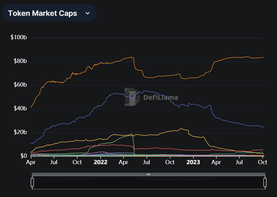 Рыночное предложение стейблкоинов снижается с конца 2022 года. По данным DeFiLlama, оно находится на двухлетнем минимуме и составляет $123,8 млрд.