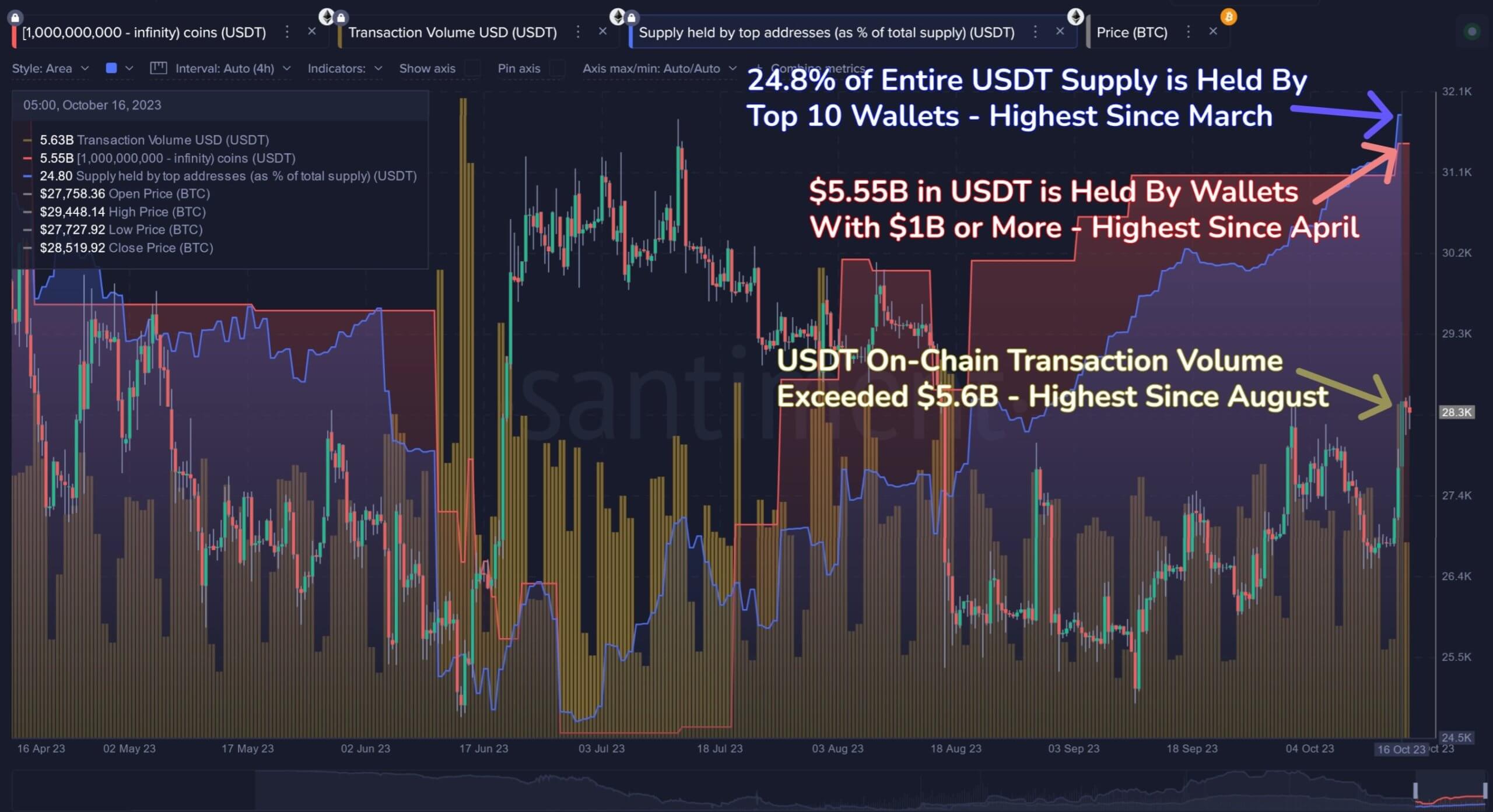 В пользу версии о готовности криптоинвесторов закупаться говорит и увеличение объёма стейблкоина USDT на крупнейших адресах. Накануне доля этих монет на десяти наибольших адресах прыгнула до 24.8 процента от всех монет в обороте, что стало рекордом с марта 2023 года. А поскольку стейблы используются как раз для покупки других криптоактивов, энтузиазм экспертов по поводу происходящего довольно предсказуемый.