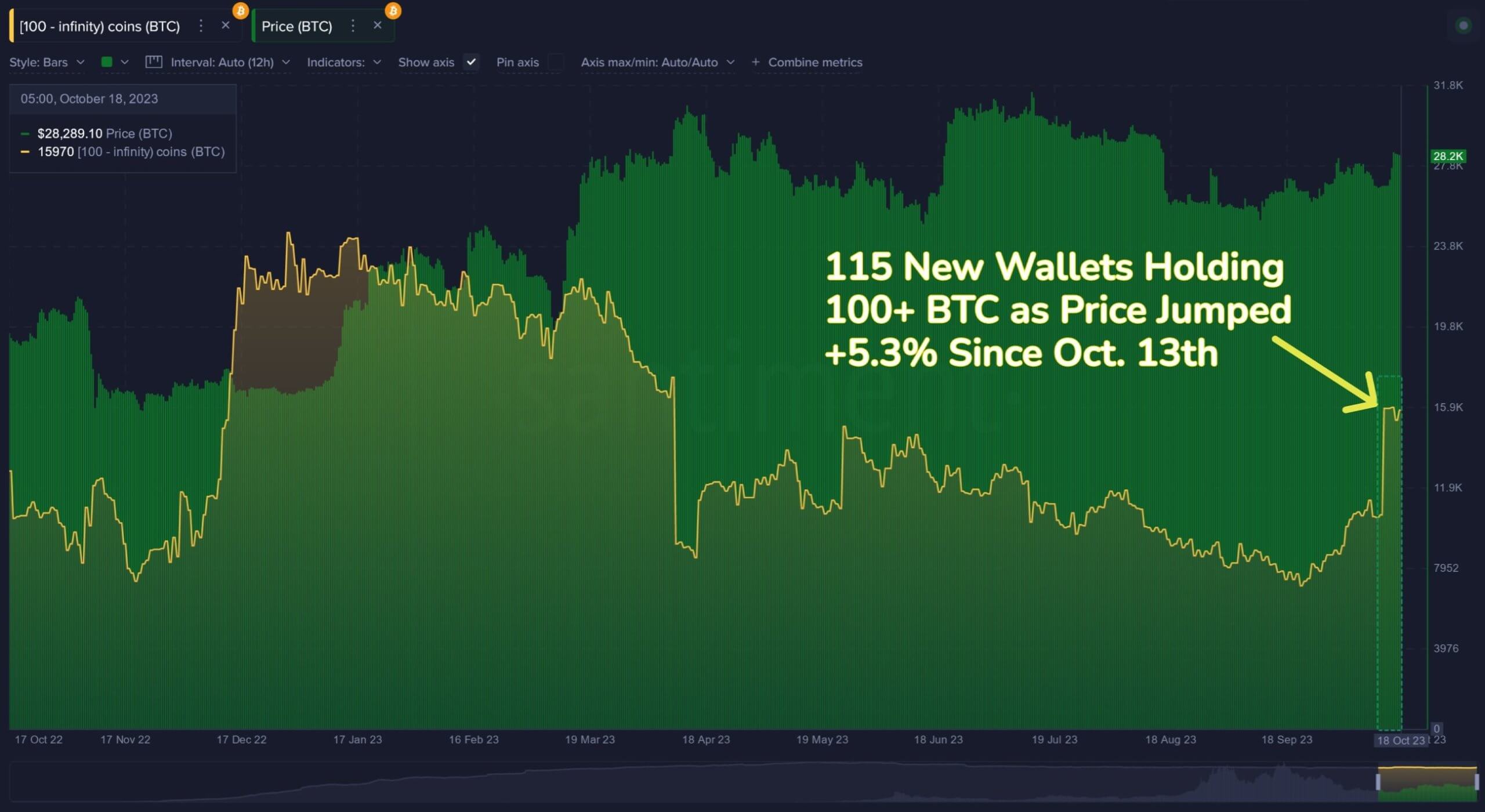 С учётом происходящего накапливать BTC продолжают в том числе держатели крупного капитала. К примеру, число адресов с как минимум 100 BTC на балансе накануне достигло уровня 15 970 единиц. Что особенно важно, в последнюю субботу этот показатель увеличился на 115 штук. А это — крупнейшее его увеличение в 2023 году.