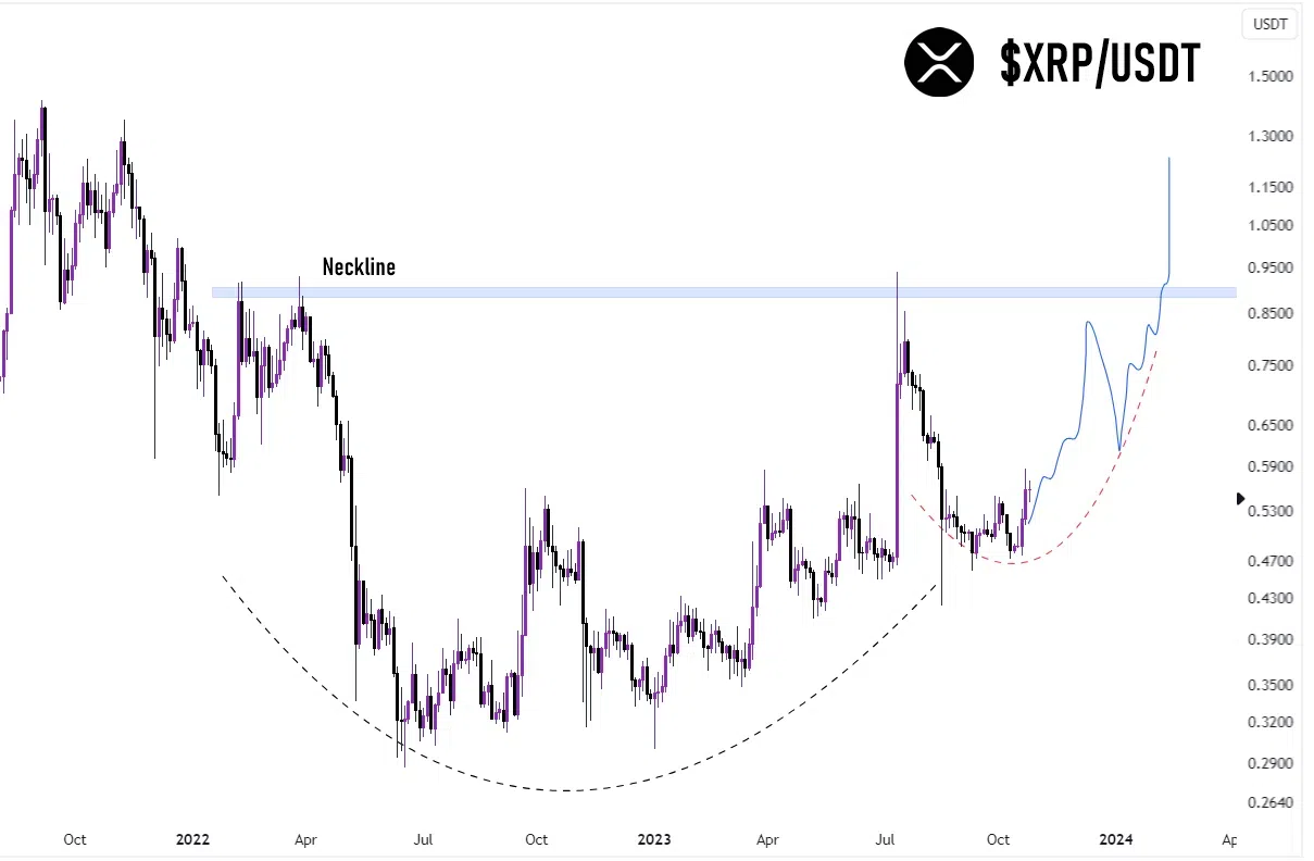 Наиболее оптимистично настроен Thescalpingpro, который разглядел на графиках долгосрочный паттерн «чашка с ручкой» с линией сопротивления на уровне $0,90. Прорыв выше этой отметки подбросит XRP значительно выше $1.