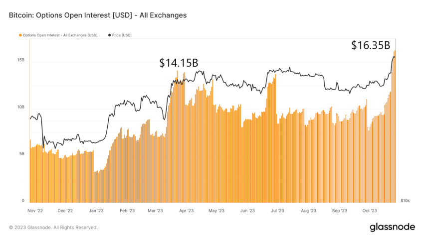 26 октября открытый интерес на рынке опционов на биткоин достиг нового исторического максимума (ATH). Данные аналитической компании Glassnode показывают, что объем всех позиций пут и колл достиг $16,35 млрд. Предыдущий максимум в $14,15 млрд был зафиксирован в марте 2023 года.