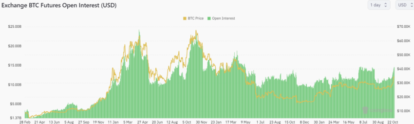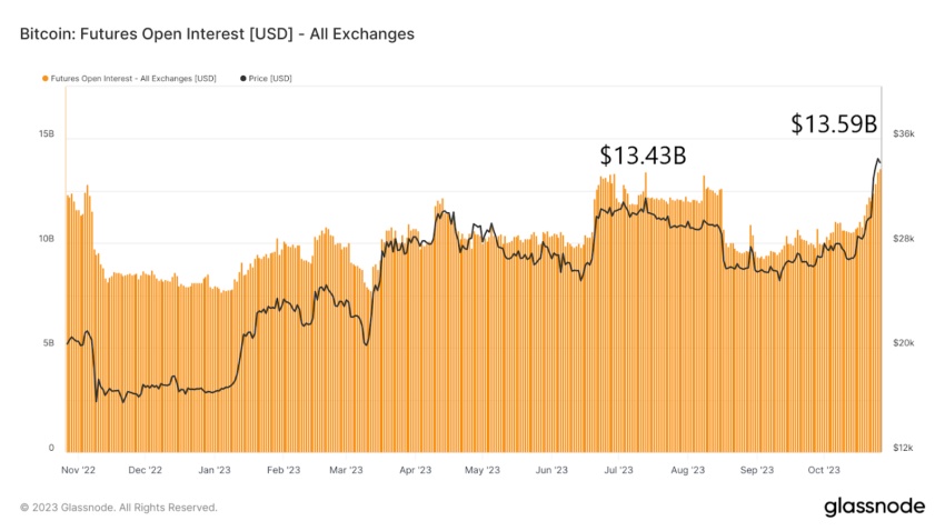 Аналогичную ситуацию мы наблюдаем и на рынке фьючерсов на биткоин. Данные Glassnode показывают, что 26 октября совокупный объем открытых фьючерсных контрактов на крупнейших криптовалютных биржах, среди которых Binance, Bitfinex, BitMEX, Bybit, CME, Deribit, HTX, Kraken и OKX, достиг годового пика в $13,59 млрд.