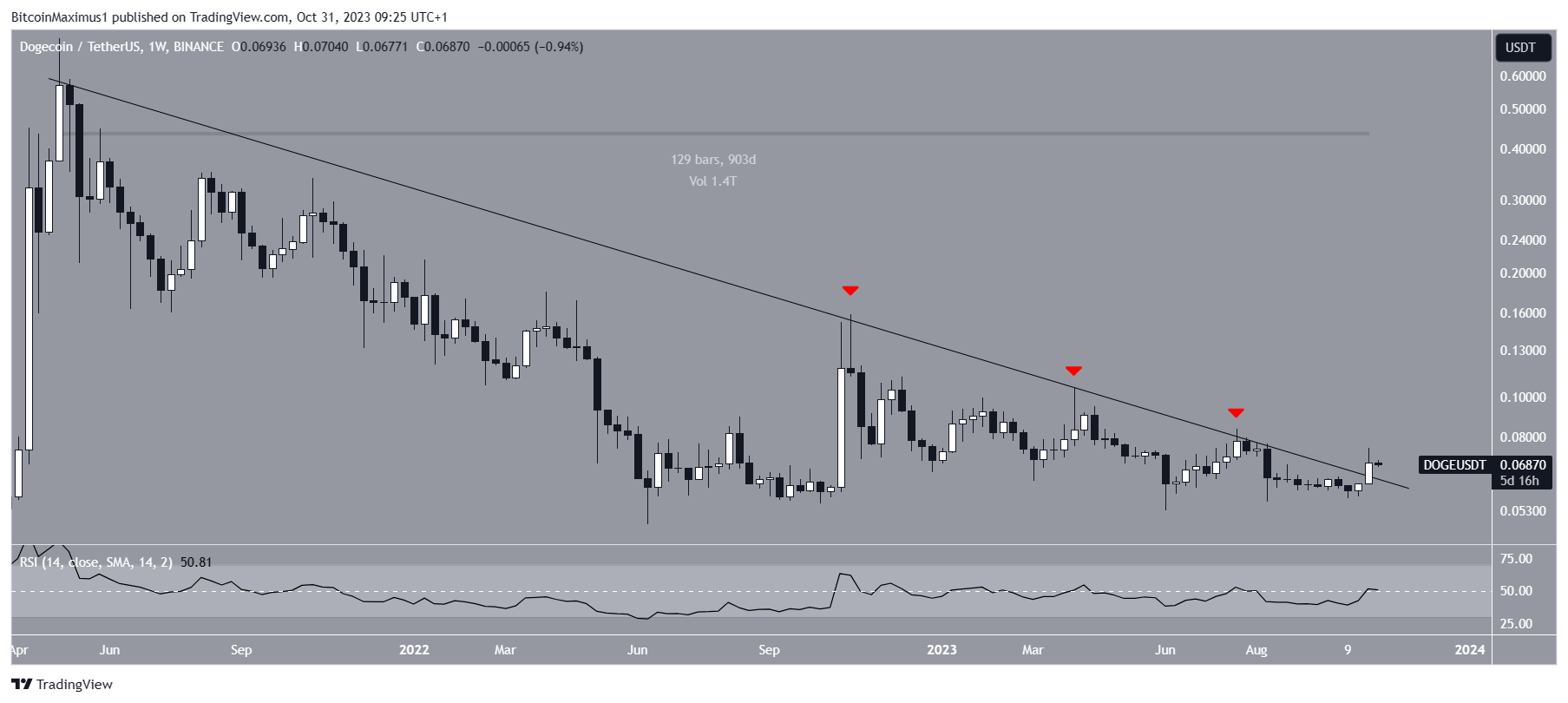 Цена Dogecoin ($DOGE) прорвалась выше долгосрочной нисходящей линии сопротивления, построенной от исторического максимума