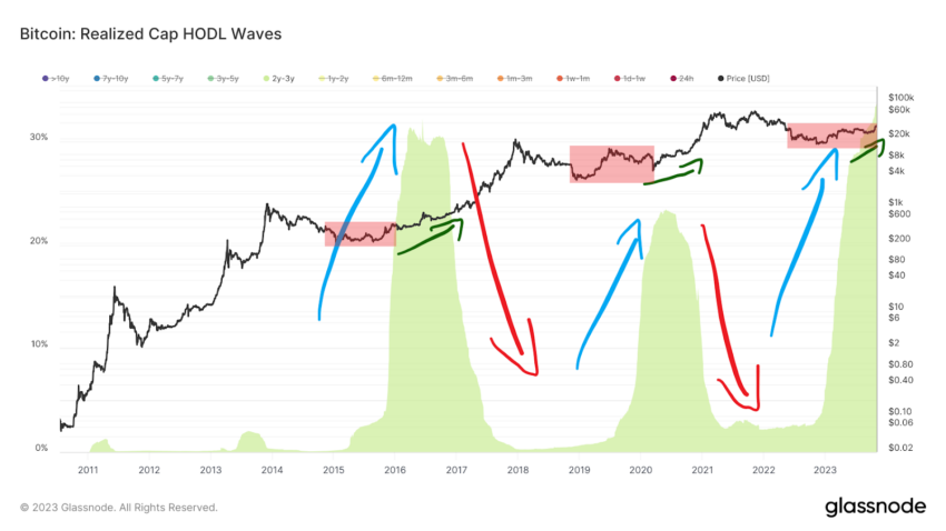 Всплеск держателей в 2-3-летнем диапазоне (синие стрелки) произошел сразу после окончания фазы накопления и последовал за макрдном цены биткоина (красный прямоугольник). Когда цена BTC вступила в зрелый бычий рынок (зеленая стрелка), эта волна достигла многомесячного пика,