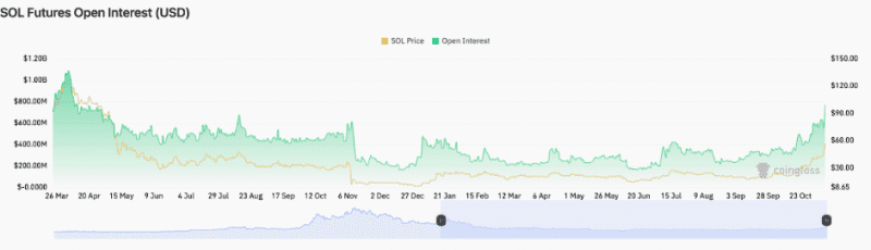 11 ноября открытый интерес к фьючерсам Solana достиг значительного уровня — около $772 млн, что является самым высоким показателем с ноября 2021 года, когда цена SOL установила рекордный максимум в $260. Высокие уровни открытых процентов указывают на больший интерес и потенциально большую ликвидность на рынке.