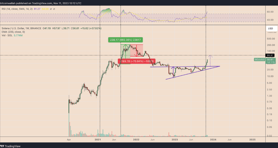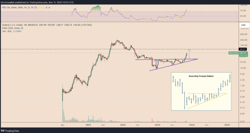 Достижения Solana на этой неделе кажутся частью бычьего прорыва. Примечательно, что две недели назад цена SOL преодолела сопротивление горизонтальной линии тренда восходящего треугольного канала.