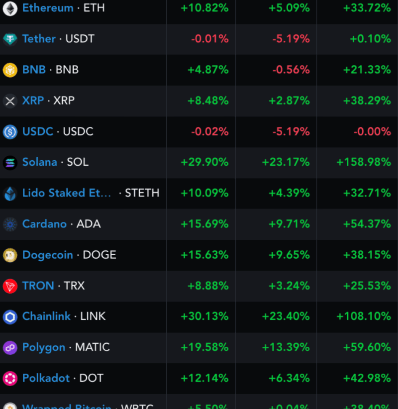 Эйфория биткойн-ETF является одной из основных причин общего роста цен на криптовалюту, вызванного ростом биткойна до 38 000 долларов. Солана, однако, показала лучший результат за последние 30 дней.