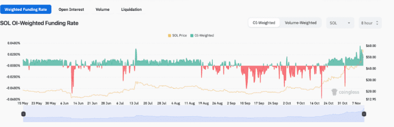 Ранее на этой неделе ставка финансирования SOL выросла до 0,035% за восемь часов. Эта ставка финансирования представляет собой недельную стоимость 0,735% для длинных позиций с кредитным плечом, что указывает на сильные бычьи настроения на рынке.