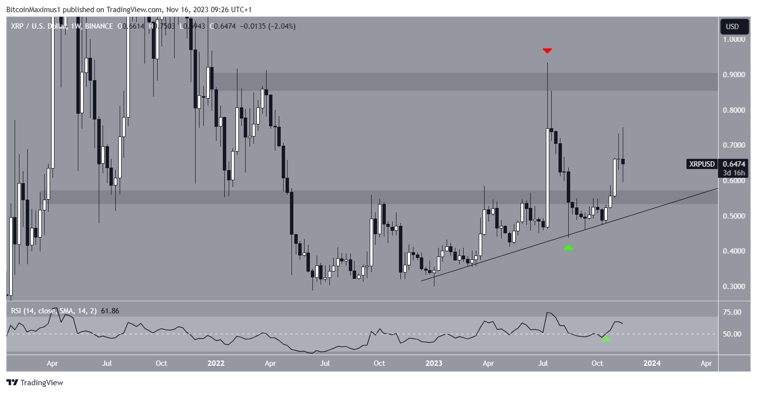Недельный график показывает, что с начала года цена XRP росла вдоль восходящей линии поддержки. За это время она прорвала горизонтальную область сопротивления $0,55 и в июле достигла нового годового максимума на $0,94 (красный значок).