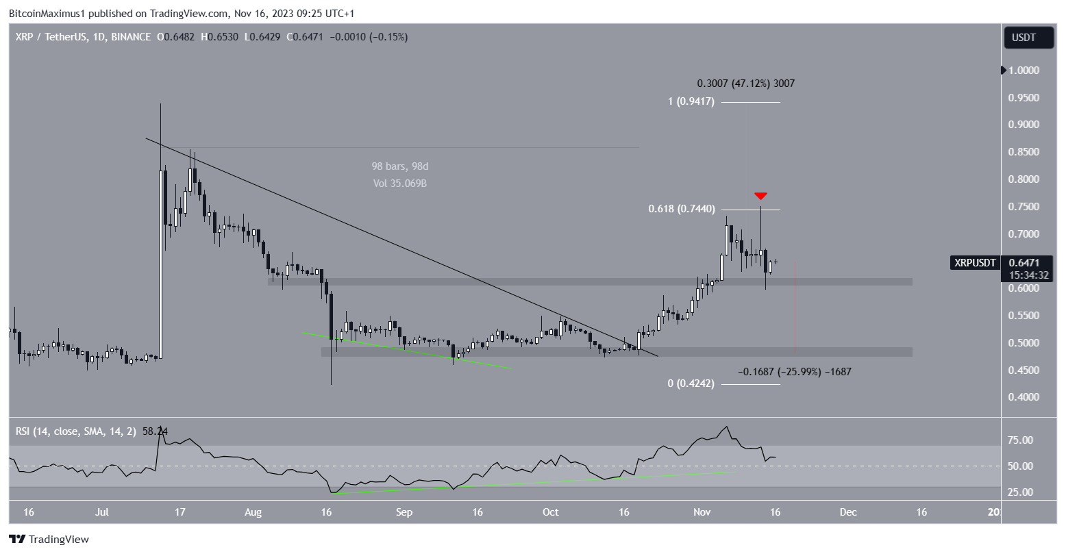 После бычьего прорыва 13 ноября цена отскочила от уровня сопротивления Фибоначчи 0,618 коррекции. Это привело к образованию длинного верхнего фитиля (красный значок) и подтвердило область $0,74 в качестве сопротивления. После отскока цена XRP упала.