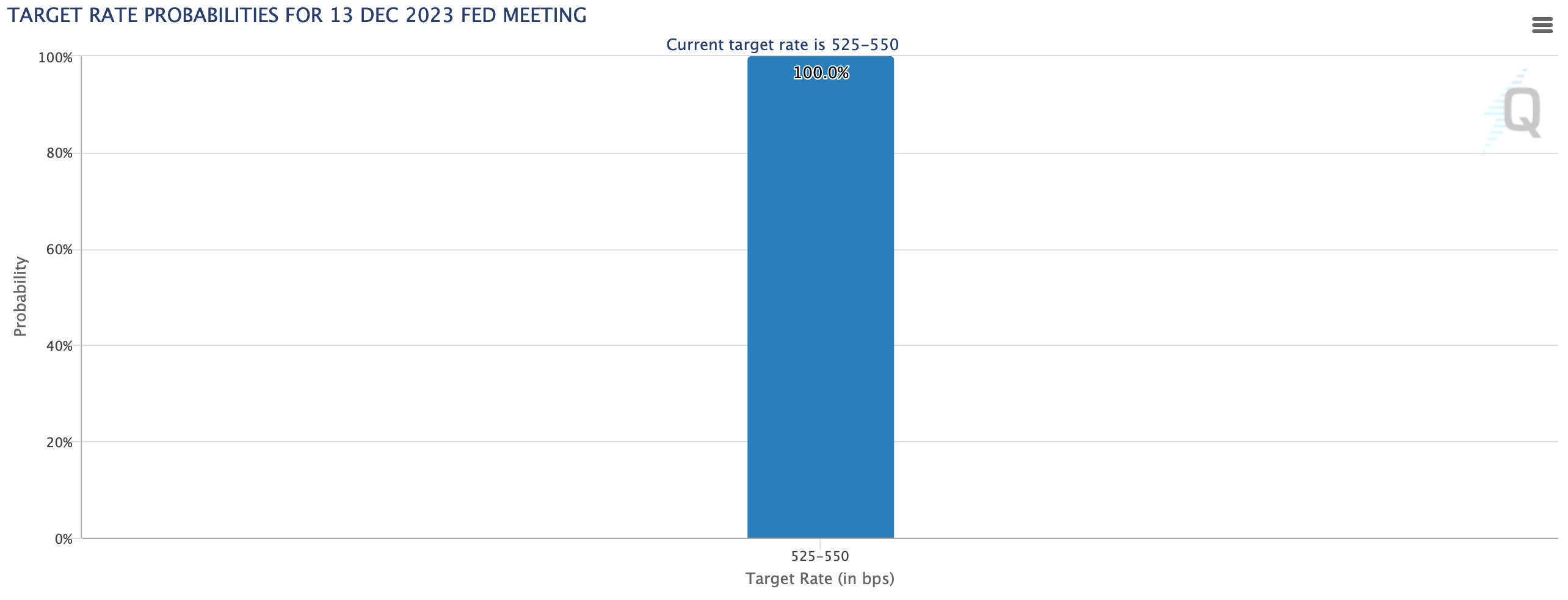 Что особенно важно, после публикации этих данных рынок перестал делать ставку на дальнейшее повышение базовой процентной ставки в ходе заседаний Федерального комитета открытого рынка (FOMC). Сейчас эксперты считают, что во время следующей встречи FOMC 13 декабря 2023 года представители ФРС оставят базовую ставку на актуальном уровне. Ну а перспектива её повышения даже не рассматривается.