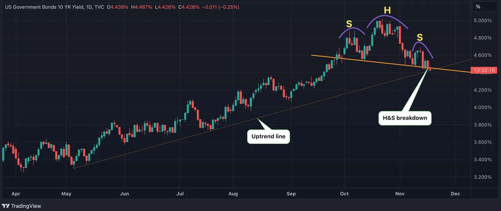 Доходность по десятилетним облигациям может снизиться ещё больше, поскольку на дневном графике актива наблюдается фигура технического анализа «голова и плечи». Об этом в своём недавнем отчёте заявили аналитики EFG Bank, которые делают ставку как раз на проседание доходности.