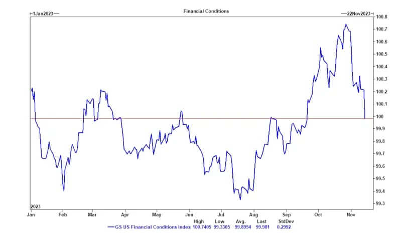 Позитивный прогноз также можно составить с учётом индекса финансовых условий (FCI), разработанного банковским гигантом Goldman Sachs. Несколько недель назад он начал стремительно снижаться, что указывает на устойчивость экономики США. Это также говорит о том, что ФРС не будет повышать базовую кредитную ставку в будущем, мотивируя инвесторов вкладывать собственные деньги.