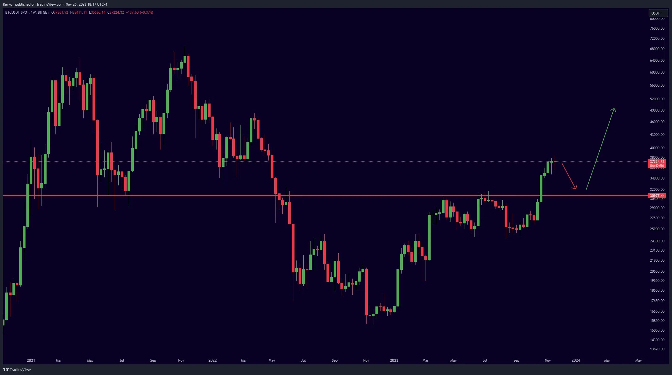 Некоторые участники криптосообщества поддерживают другой прогноз биткоина. По их мнению быки уже потратили все силы и теперь BTC рискует отправиться в затяжную коррекцию, которая вернет монету в район $31 тыс. Такой прогноз биткоина поддерживат трейдер Mister Crypto.