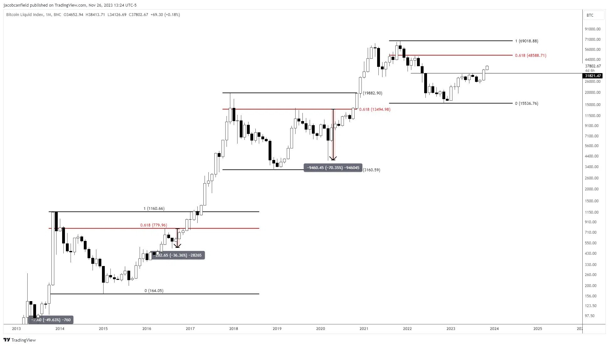 С мнением о том, что впереди BTC ждут уровни $45 тыс. плюс согласился популярный трейдер Джейкоб Кэнфилд. По его мнению, движение криптовалюты к обознеченной высоте уже запрограммировано. Свой прогноз биткоина Кэнфилд сопроводил графиком с разметкой предполагаемых уровней, к которым будет стремиться BTC.