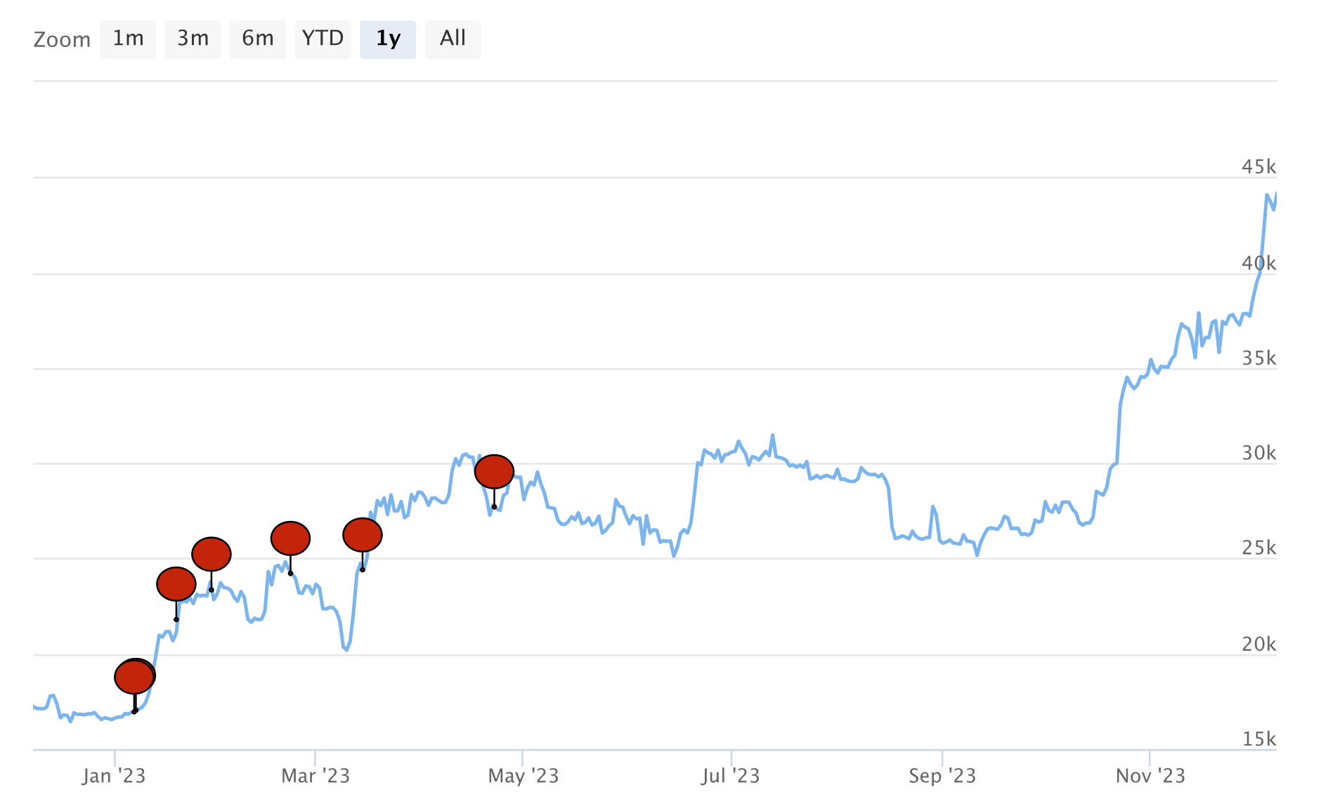 Важно отметить, что в ноябре 2023 года был установлен рекорд по числу упоминаний Биткоина в документах, поданных в Комиссию по ценным бумагам. Это в первую очередь обусловлено подготовкой к запуску новых ETF на первую криптовалюту в США. Предполагается, что подобное может произойти в первой половине января 2024 года, то есть на протяжении следующего месяца.
