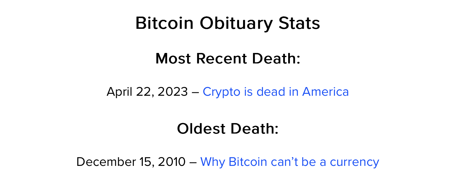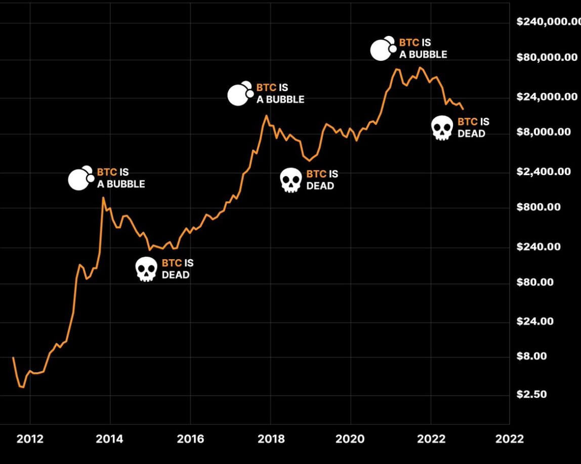 По данным платформы 99Bitcoins, с 2010 года Биткоин официально провозглашали «мёртвым» 474 раза. Чаще всего криптовалюте прогнозируют смерть во время длительных медвежьих трендов, на протяжении которых наблюдается вполне предсказуемый спад интереса к цифровым активам. Тем не менее, Биткоин вместе с остальными монетами каждый раз «возрождался», а его цена устанавливала новый исторический максимум. Даже самые критические моменты в истории главной криптовалюты не привели к её фиаско.
