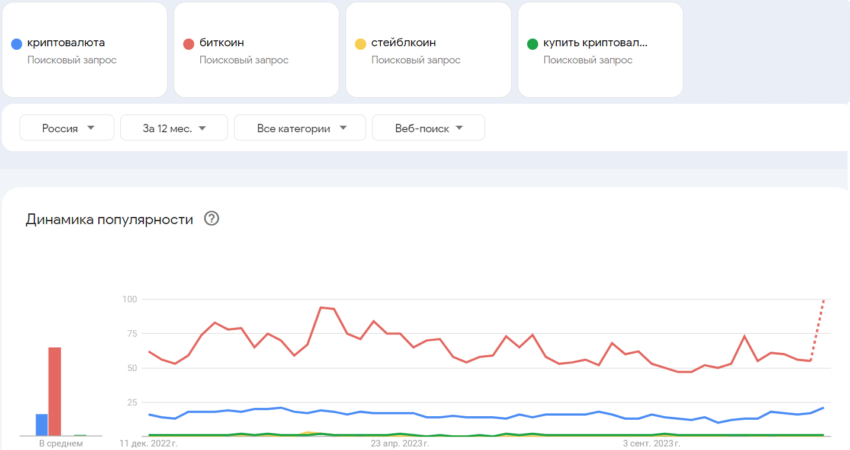 Статистика поисковых запросов Google.Trends также указывает на то, что за год, за исключением ряда вспышек, интерес россиян к криптовалюте существенно не изменился.